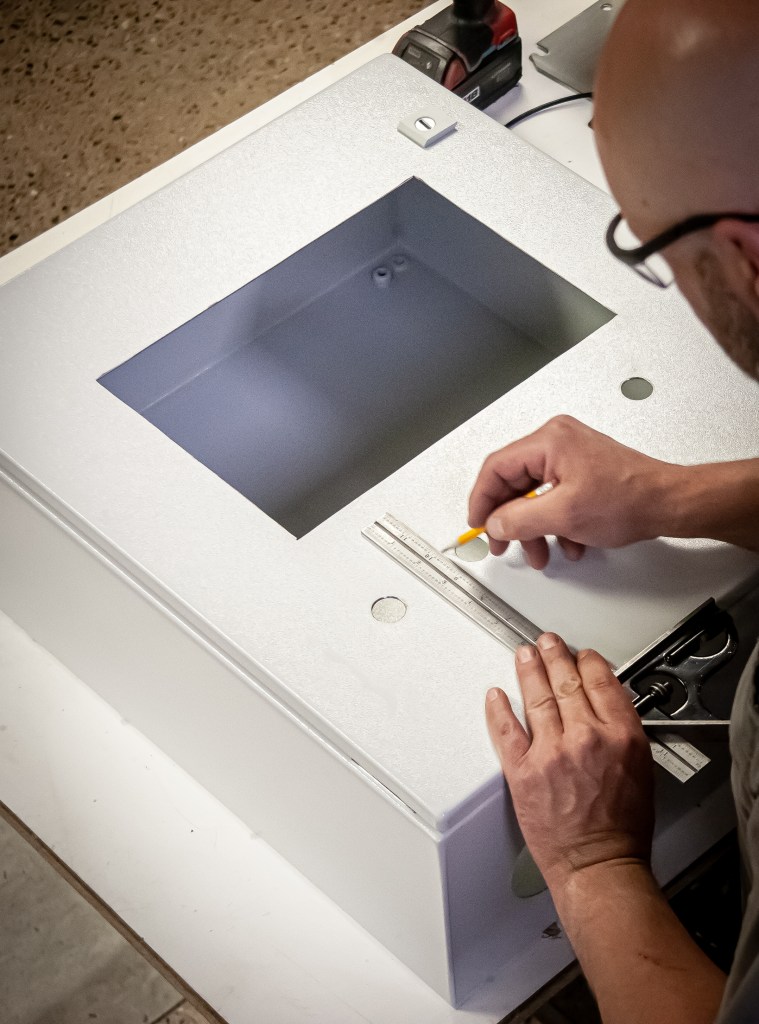 This photograph features one of our controls electricians shortly after completing the cut-outs of an HMI enclosure.