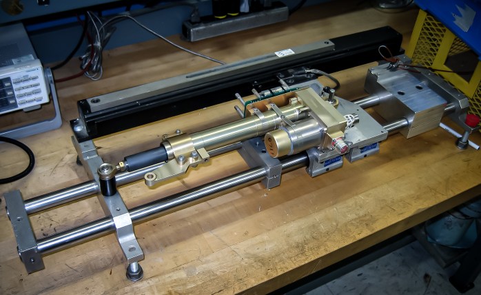 On the left, a fabric stretching assembly prototype is shown after a successful bench-test. The application that was previously used for fabric stretching was considered to be time consuming and inadequate. Alto Precision then designed and built a prototype that met the customers functionality requirements.